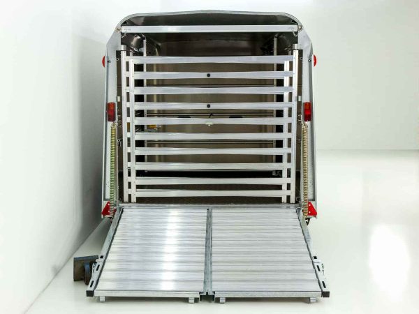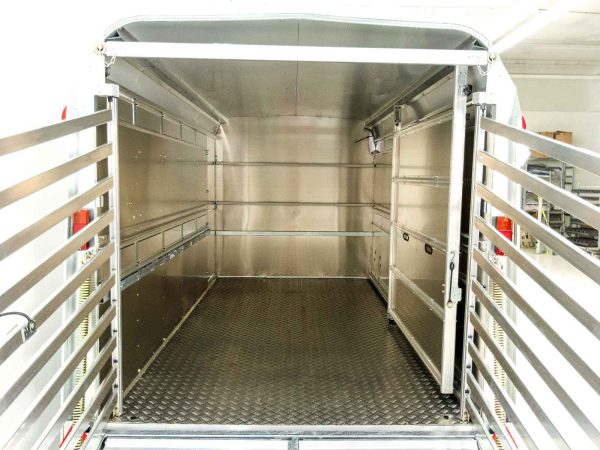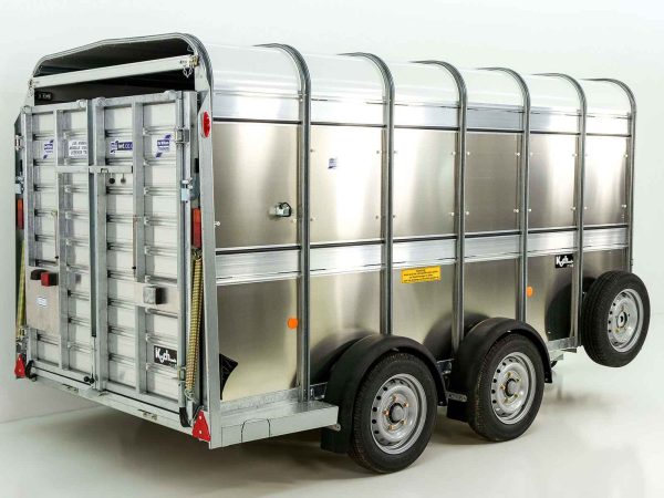Przyczepa Ifor Williams TA510 12×6 z wysokością 183 cm posiada Kombi-drzwi (połączenie ramy i drzwi) oraz dzielone drzwi wejściowe z przodu. Zapewnia bezpieczny transport bydła dzięki dachowi refleksyjnemu i bocznym klapom wentylacyjnym.