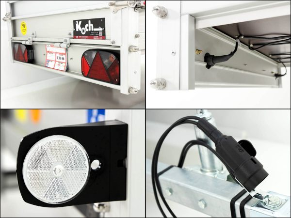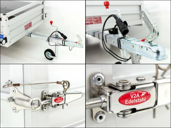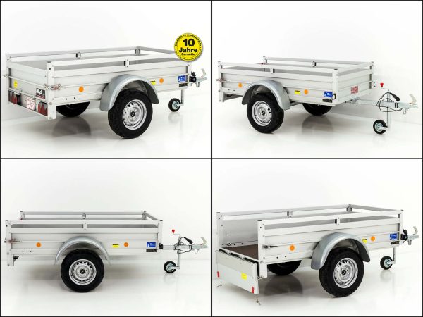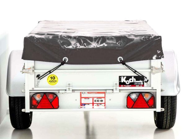 Przyczepa Koch Typ U2 z plandeką płaską Profi w kolorze antracytowym. Stabilne burty alu 30 mm, reling 4-stronny, hak montowany. Wymiary 105 x 205 x 45 cm, masa 130 kg, ładowność 620 kg, DMC 750 kg. 10 lat gwarancji.