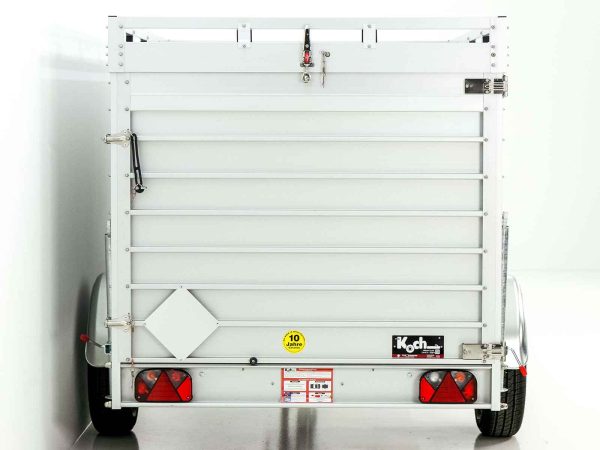 Przyczepa Koch Typ 6.13 z pokrywą i drzwiami bocznymi. Wymiary 150 x 250 x 125 cm, ładowność 980 kg, DMC 1300 kg. Aluminiowa konstrukcja, burty alu eloks. podwójne 30 mm, reling 4-stronny, zamki V2A. Oś gumowa bezobsługowa, amortyzatory, gazowe podnoszenie klapy. 10 lat gwarancji.