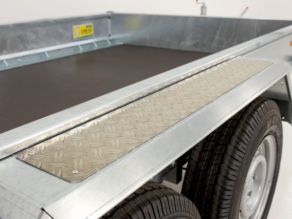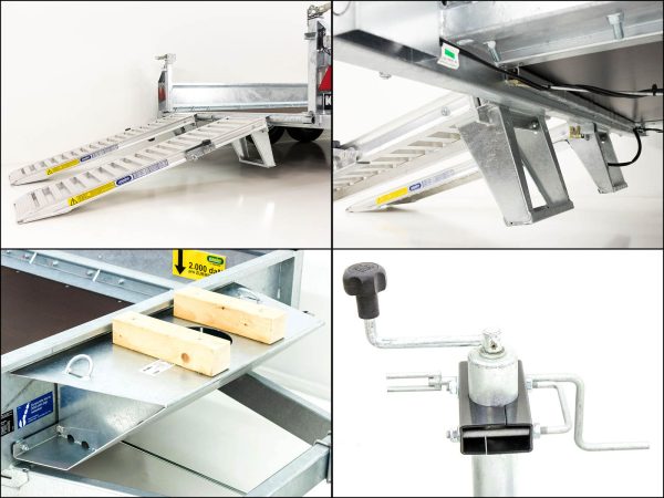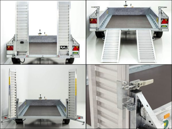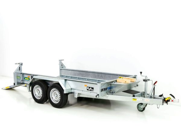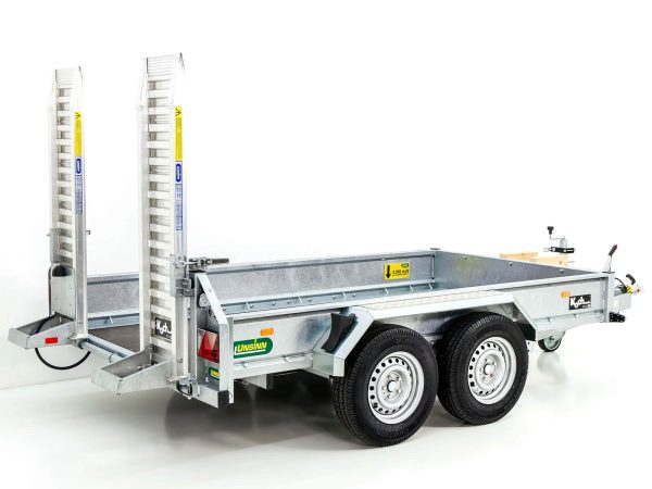 Przyczepa Unsinn UBA oferuje stabilną, ocynkowaną ramę rurową i wyposażona jest w rampy uchylne, które można przesuwać i blokować. Dzięki ładowności do 2815 kg nadaje się idealnie do transportu ciężkich maszyn budowlanych.