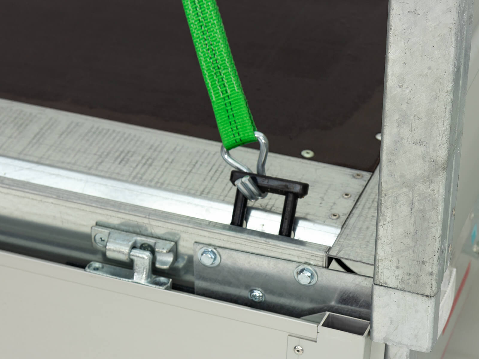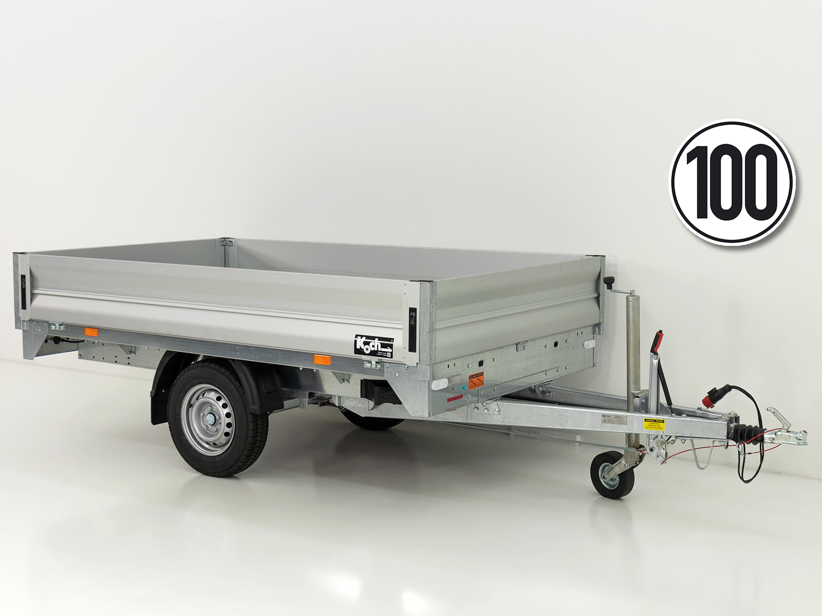 Przyczepa Vezeko D27.3 Hochlader z dużą powierzchnią załadunku 182 x 317 cm. DMC 2700 kg, masa własna 500 kg, ładowność 2200 kg. Aluminiowe burty 350 mm, klapowe i zdejmowane, skrzynia narzędziowa, 6 uchwytów do mocowania. Opcja: 100 km/h.